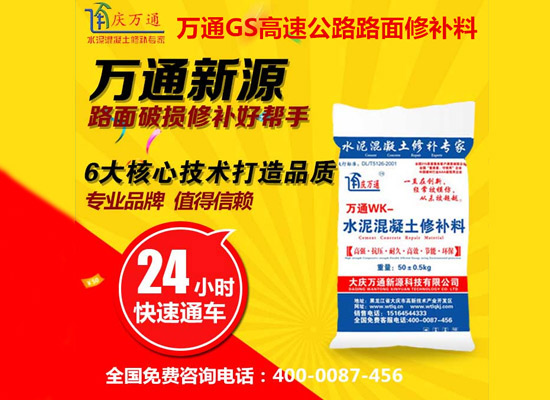 大慶萬通新源科技有限公司獨有的混凝土路面高強速補料,是水泥混凝土路面病害修復的好材料。疲勞、凍融循環、彎曲壓力、滲水和基層破壞等原因都會引起水泥路面的破損,從而帶來高昂的維護費用。與以往的剛性修補方法不同,混凝土水泥路面維修速補膠提供了一種獨特的柔性修補產品和技術,高柔性、高抗拉性,可跨伸縮縫施工和高抗壓性使得混凝土快補產品為水泥混凝土路面提供了******性的修補。傳統的剛性修補方案,如環氧砂漿和快干水泥產品,由于其自身的粘結失效,抗疲勞性低以及與原路面不同的伸縮系數,修補面會在短時間內失效或產生新的裂縫,需要反復修補,有效期短且費用高昂。大慶萬通新源科技有限公司的混凝土水泥路面維修速補膠可以隨原路面一起伸縮,移動,從而避免了粘結失效和產生新裂縫。萬通快補產品優異的粘結性、柔韌性和高防滑性,特別適用于水泥路面的淺層粘合修補,多邊角混凝土板層修補,跨伸縮縫修補以及路面沉陷修補。萬通混凝土病害修補料針對混凝土起皮起沙、斷板裂縫、蜂窩麻面、坑槽露石子、漏筋掉皮、橋梁的掉皮漏筋快速通車使用時間長。應用萬通快補產品,施工后一天就可以恢復交通。大慶萬通新源科技有限公司的萬通水泥路面維修速補膠適用于高速公路、機場路面、農村村村通路面、廠坪、學校操場、市區公路、小區路面、橋梁、水泥路面的修補。使用萬通特快補材料修補路面可以一勞永逸! 水泥地面起砂怎么辦,混凝土修補劑混凝土地面起砂,混凝土地面修補,地面起砂怎么辦,